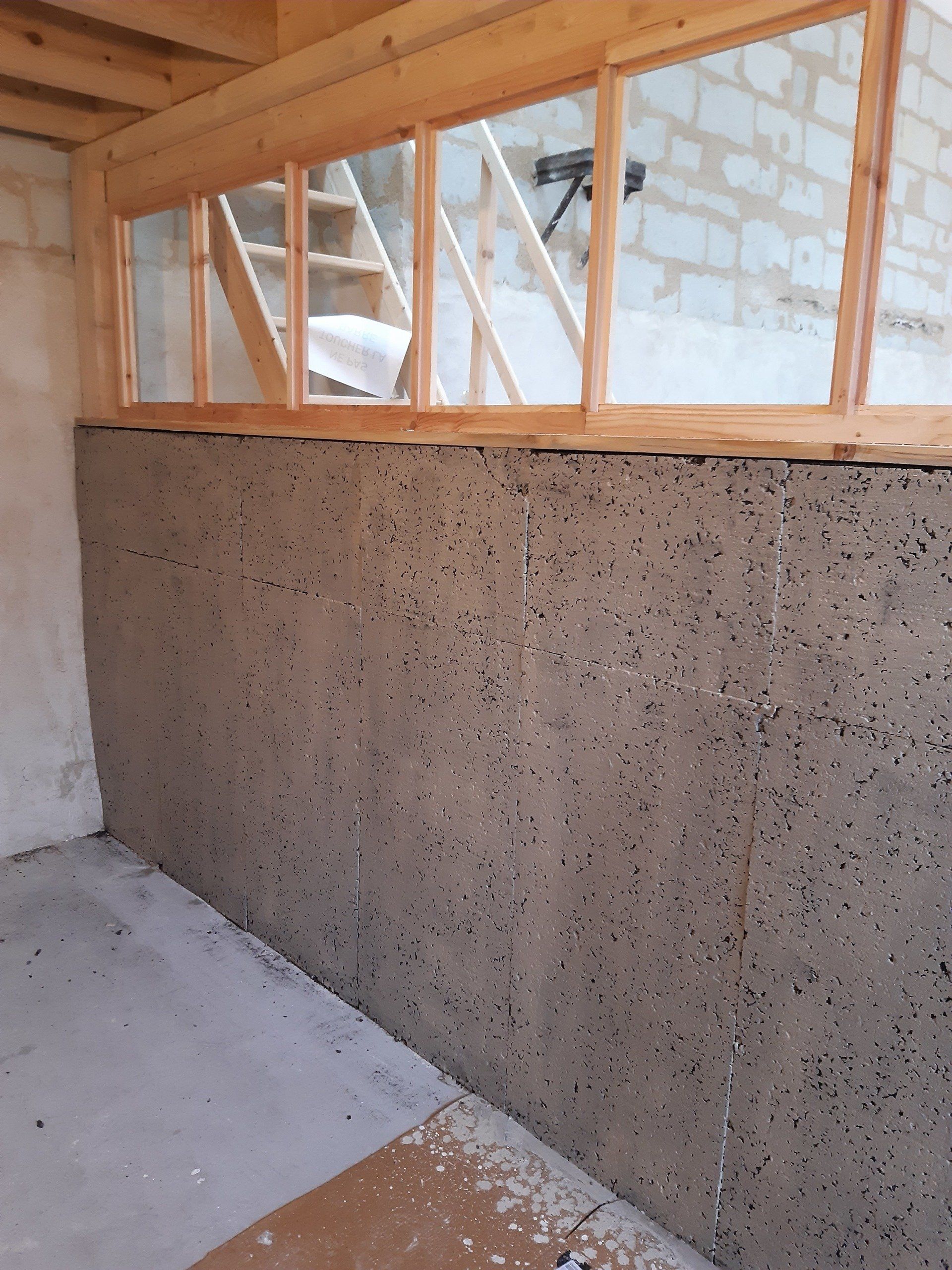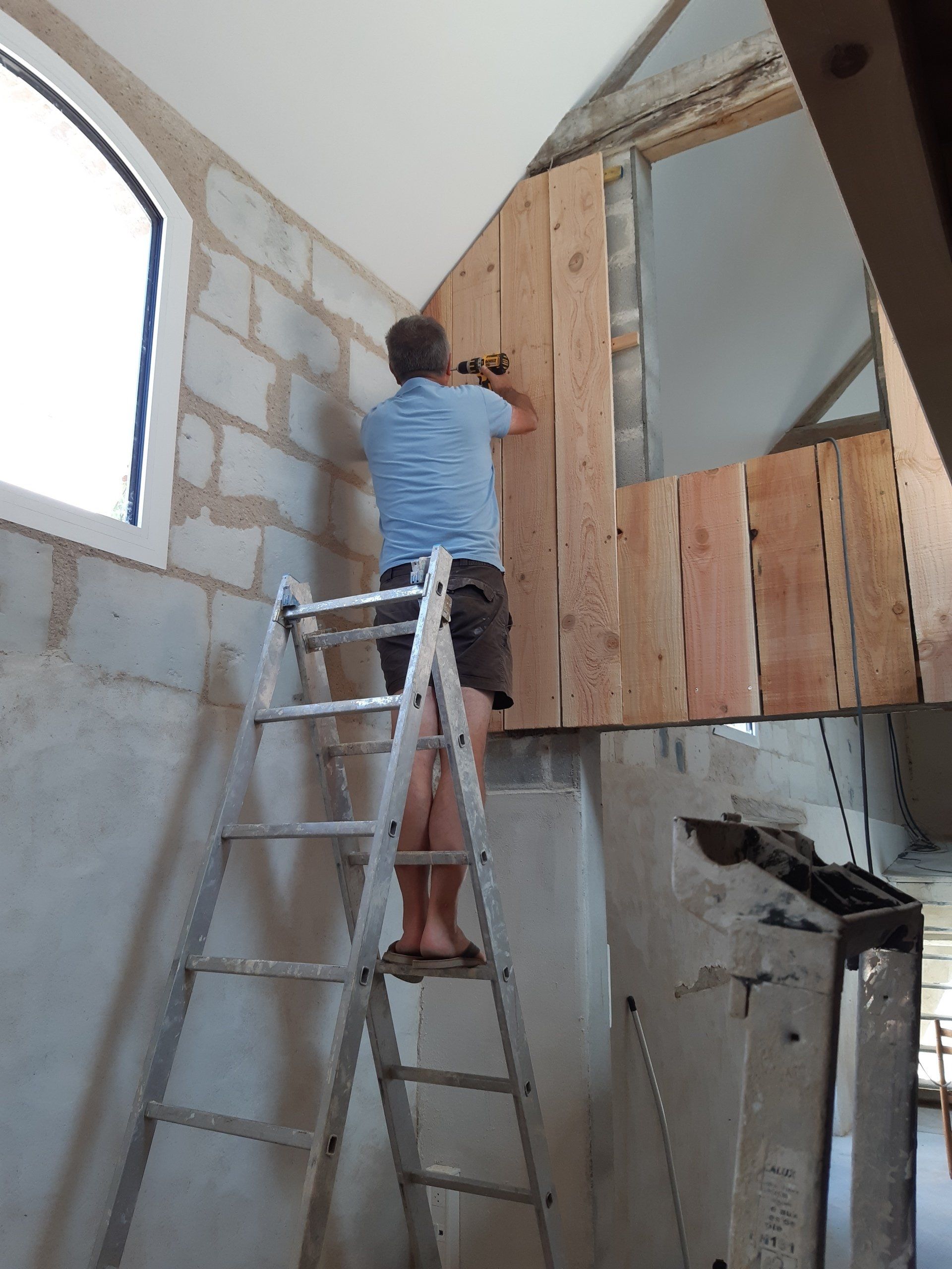 Juillet, fin des maçonneries et réseau électrique mais aussi chaulage de la salle de formation, pose de l'escalier et peinture par nos soins .....